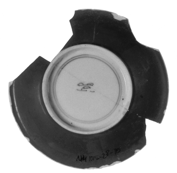 | 5c | inwendig: onderglazuur blauw: landschap aan de rivier, in standring dubbele concentrische ringen, uitwendig bruin onderglazuur blauw, bruin |