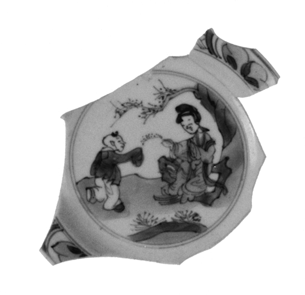 | 5c | uitwendig: onderglazuur blauw: twee concentrische ringen met merk; vlag: onderglazuur blauw: servetwerk met medaillons; spiegel: onderglazuur blauw: lange Lijs en zotje in tuin onderglazuur blauw |