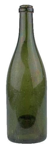 | 4b | dikwandige cilindrische champagnefles waarvan de schouder vloeiend overgaat in een lange hals, afgewerkte lip met platte draad, hoog opgebolde bodem, 1900-1950 draaismeer (1875-1925) |