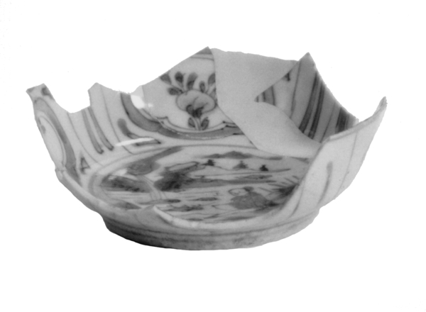 | 5c | vlag: onderglazuur blauw: Kraak-stijl paneel indeling; spiegel: onderglazuur blauw: kluizenaar bij waterval onderglazuur blauw |