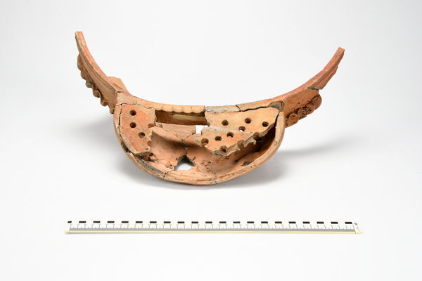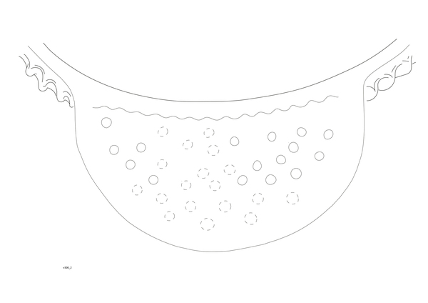 | 5d | zeer grote schenklip aanwezig in wand, de rand loopt hierover door en de lip is afgedekt met een rooster. De bovenkant van het rooster heeft slijtagesporen. melkteil?, tuit om melk af te romen? wastobbe of melkteil |