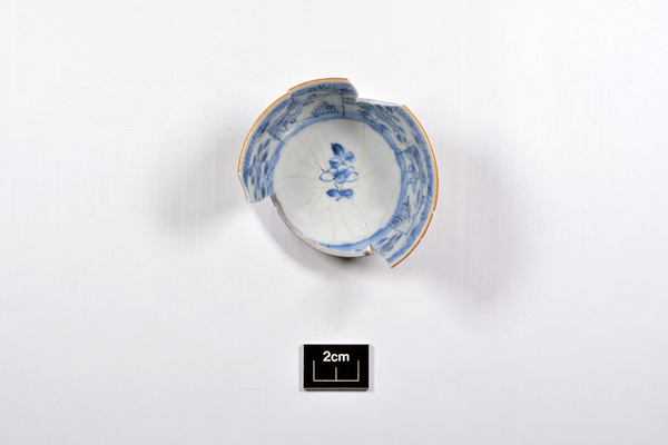 | 5c | inwendig: blauwe beschildering: landschap met bloemen, uitwendig: ijzerengobe |