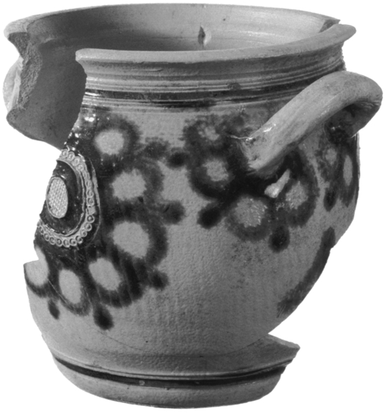 | 5c decoratie | uitwendig: op buik en om oren bloembladen, medaillon op buik, 'wafel en cirkelring' federendes Blättchen uitwendig: blauw |