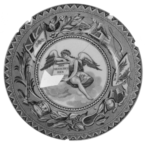 | 5c decoratie | vlag: Union Jack, trommels, adelaars in blauw; spiegel: engel met tekst: 'Den Menschen een …gen' blauw |