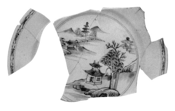 | 5c decoratie | spiegel: onderglazuur blauw: landschap met pagodes, heuvels en bomen onderglazuur blauw |