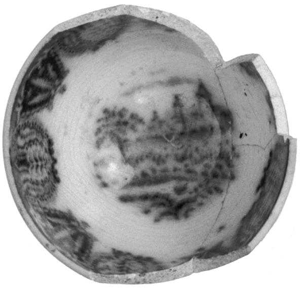 | 5c | inwendig en uitwendig: drukdecor in blauw: landschap met drie torens blauw |