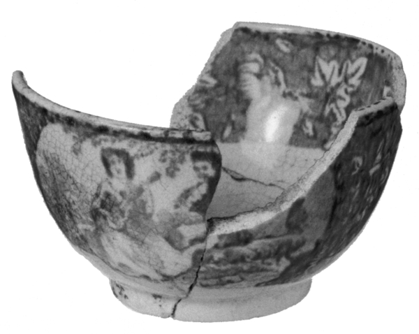 | 5c | inwendig: drukdecor in blauw: wandelaar; uitwendig: drukdecor in blauw: musicerend paar, zij: kleine gitaar, hij: fluit blauw |