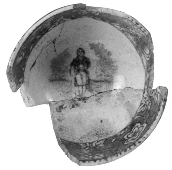 | 5c decoratie | inwendig: drukdecor in blauw: wandelaar; uitwendig: drukdecor in blauw: musicerend paar, zij: kleine gitaar, hij: fluit blauw |