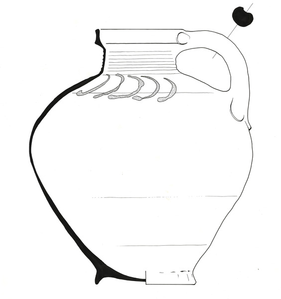 | 5d | pottenbakkersafval, tweeledig worstoor, 3 vingerindrukken bij aanzet op buik, twee vingerindrukken bij aanzet op rand |