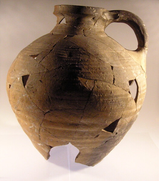 | 5d | pottenbakkersafval, grijsbakkend bedoeld, maar deels geoxideerd, bodem ontbreekt, tweeledig worstoor, 3 vingerindrukken bij aanzet op buik, twee vingerindrukken bij aanzet op rand |