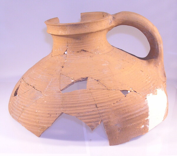 | 5d | pottenbakkersafval, tweeledig worstoor, 3 vingerindrukken bij aanzet op buik, 2 vingerindrukken bij aanzet op rand, onderkant ontbreekt |