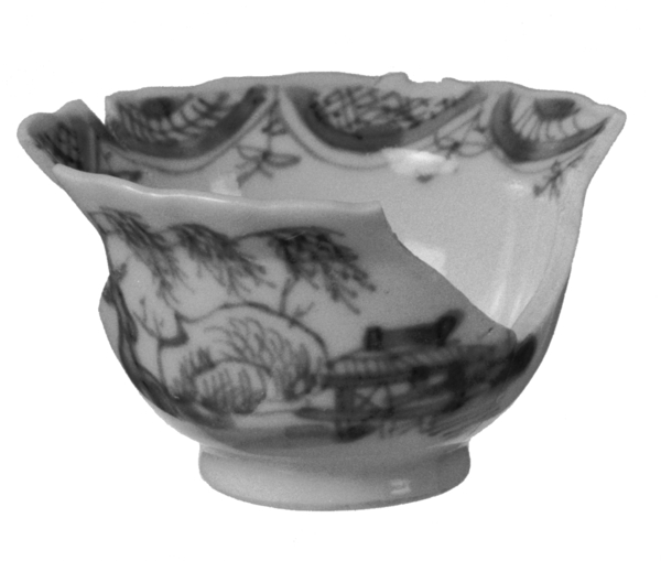 | 5c decoratie | inwendig: onderglazuur blauw: balusters; uitwendig: onderglazuur blauw: huis in landschap onderglazuur blauw |