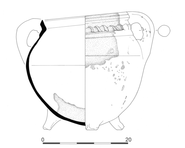 | 4b | drieledige grape met scherpe buikknik en ribbel op schouder of zone met draairibbels, zware uitstaande verdikte driehoekige rand met dekselgeul |