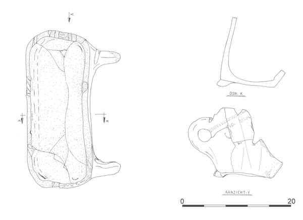 | 4b | langwerpige vetvanger met wand aan één van de lange zijden met inkepingen voor een spit en twee verticale worstoren. |
