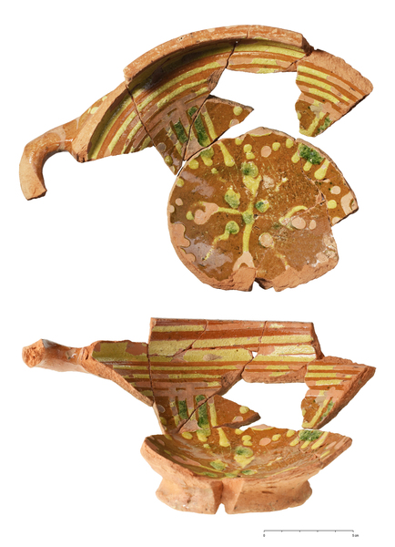 | 5c decoratie | uitwendig arcering, inwendig lijnen, stippen en kruis inwendig slib (geel en groene accenten) |