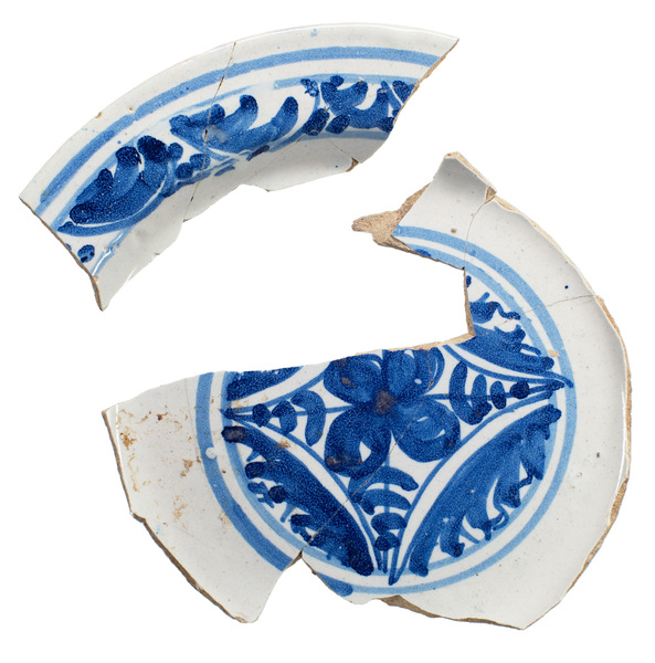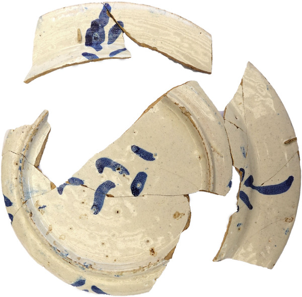 | 5c decoratie | blauw beschilderd: floraal motief, bloem in ruit, concentrisch cirkels |