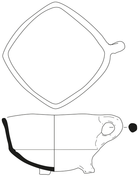 | 4b | vierkante vuurtest met scherpe knik bodem-wand en iets uitwijkende wand, afgeronde rand, poten |