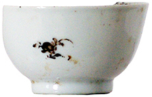 | 5c | uitwendig: enkele gekleurde bloemtjes, inwendig: onderlangs de rand een blauwe bies (bovenglazuur) met daaronder rode stippen |