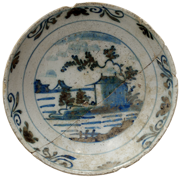 | 5c | spiegel: eenvoudig geschilderd landschap met gebouwen, water en bomen, binnenzijde rand: ornamentaal decor blauwe beschildering |