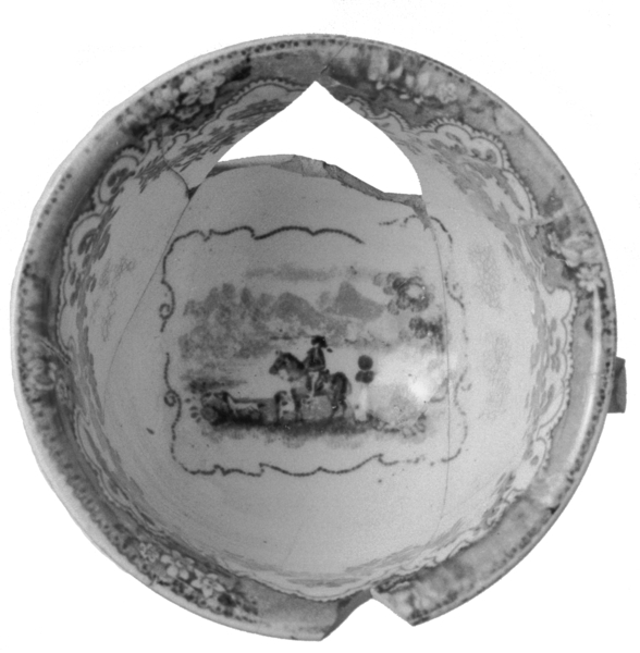 | 5c | inwendig en uitwendig: drukdecor in blauw: ruiter met twee honden die aan dame de weg vraagt, arabesken blauw |