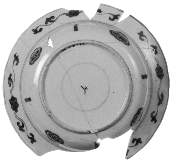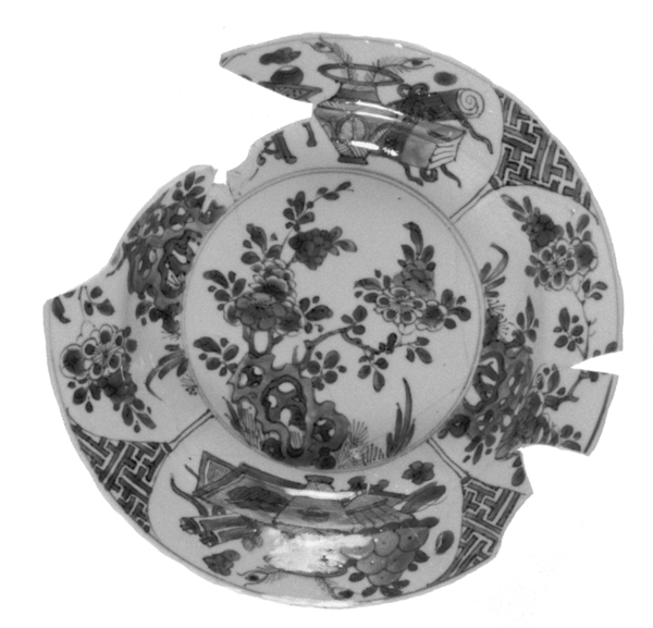 | 5c | uitwendig: onderglazuur blauw: bloemen; vlag: onderglazuur blauw: vier panelen, twee met bloemen bij een rots, twee met antiquiteiten, daartussen vouwwerk; spiegel: onderglazuur blauw: bloemen uit rots onderglazuur blauw |