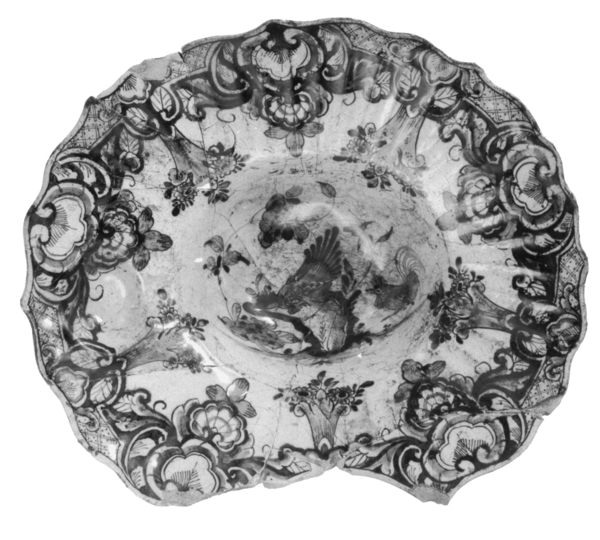 | 5c decoratie | inwendig: vl: blad- en bloemwerk. Sp: hanengevecht uitwendig: artemisiablad en dubbele ringen blauw |