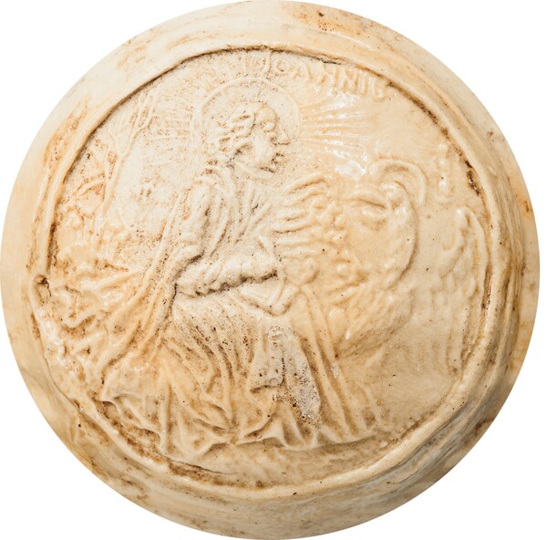 | 5c decoratie | drie identieke ronde appliques: IOANNIS, heilige apostel Johannes met adelaar |