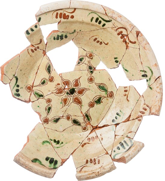 | 5c | sliblaag met rode en groene slibversiering met krastechniek: bloem binnen krans van cirkels en druppels, randmotief met meanders met arcering |
