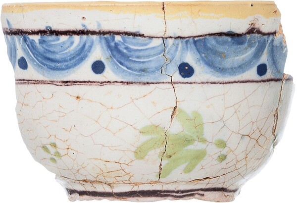 | 5c decoratie | polychroom beschilderd (blauw, paars, groen, geel): blauwe series van boogjes binnen twee paarse filets, groene blaadjes daaronder en geel filet op de rand |