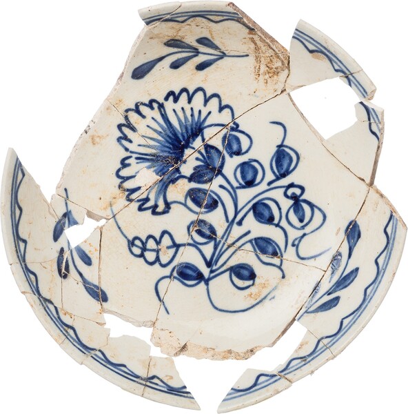 | 5c | blauw beschilderd: bloem op spiegel met takjes en randmotief van twee filets met golflijn eronder |
