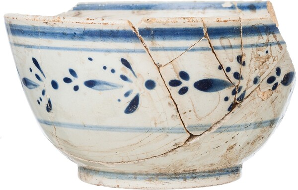 | 5c decoratie | blauw beschilderd: inwendig filet langs rand, uitwendig filets met daarbinnen een floraal motief van blaadjes met bloemen van stippen en ovaaltjes |