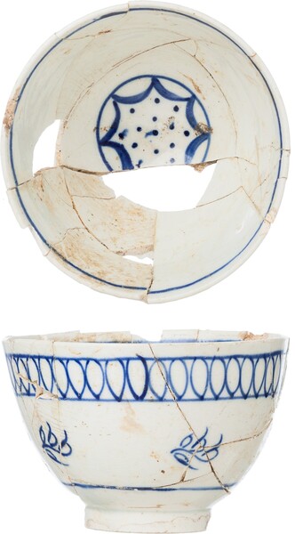 | 5c | blauw beschilderd: inwendig ster met stipjes binnen cirkel op bodem en filet langs rand, uitwendig verticale ovaaltjes binnen twee filets als randmotief en takjes met blaadjes op wand, filet boven bodem |