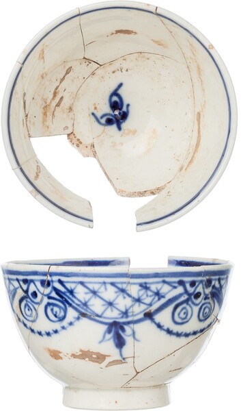 | 5c decoratie | blauw beschilderd: inwendig bloem op bodem, filet langs rand, uitwendig guirlandes met servetwerk |