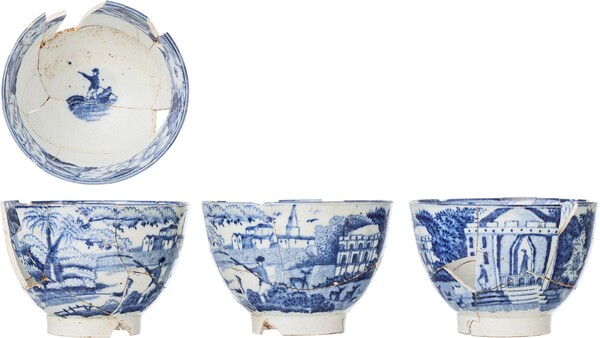 | 5c | blauw drukdecor, gestippeld: inwendig man in bootje op bodem, floraal randmotief, uitwendig landschap met gebouwen en mensen, o.a. visser |