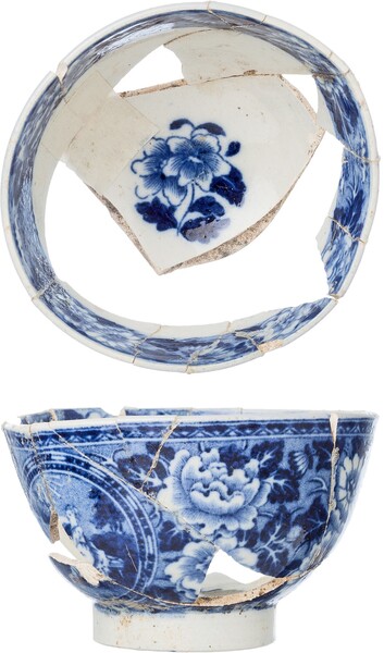 | 5c | blauw drukdecor, gestippeld: inwendig bloem op bodem en band met floraal randmotief, uitwendig twee medaillons met vrouw in tuin, omringd door floraal motief |