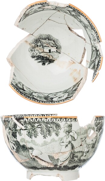 | 5c | zwart drukdecor, gestippeld, met bruine rand: inwendig floraal met huisje op bodem, uitwendig vrouw met kuip op hoofd en koeien en schapen in landschap |