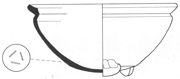 | 4b | bolle kom met ingesnoerde hals en vierkante rand, lobvoeten |