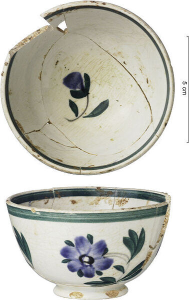 | 5c | inwendig groen randfilet en bloem op bodem; uitwendig floraal decor met groen en blauw, breed randfilet polychroom |