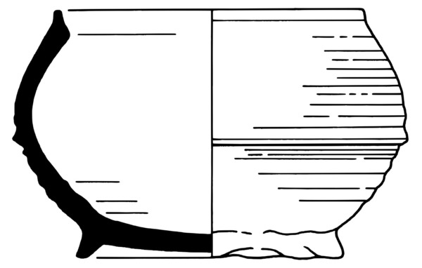 4b vorm bolle beker met ribbel op buik, zonder hals met rechte rand met lip, standring