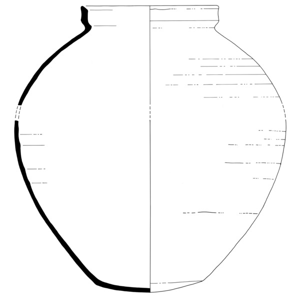 | 4b vorm | bolle pot met hoge schouder en opstaande kraag- of manchetrand met dekselgeul, lobvoeten |