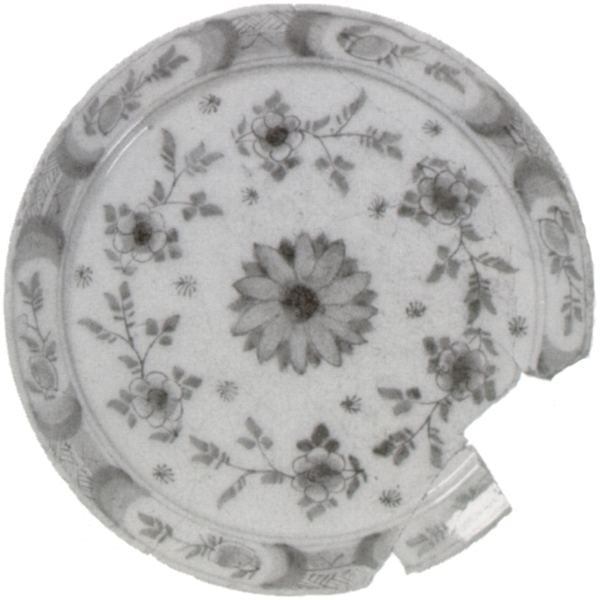 | 5c | vlag: rozenbottels met takjes in cartouches; spiegel: bloemenkrans rond centrale bloem inwendig blauw |