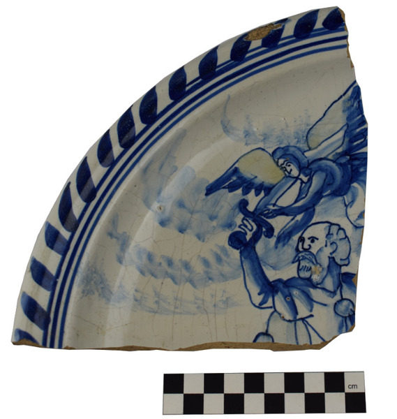 | 5c decoratie | spiegel; 'Abrahams offer'. Abraham met zwaar en een engel, vlag; kabelrand |