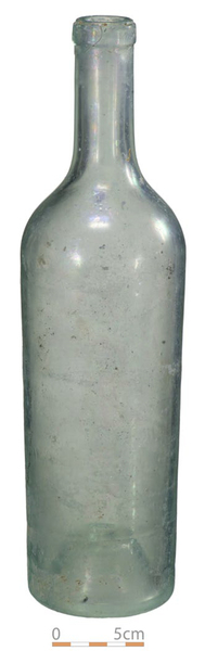 | 4b vorm | slanke cilindrische wijnfles met lange hals, afhangende afgeronde schouder, afgewerkte platte draad onder de lip, vormgeblazen, licht opgebolde bodem |