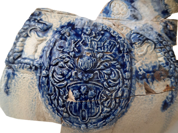 | 5c | Zegels met (niet geïdentificeerde) wapenschilden op schouder/buik. Initialen G.K. en HD bovenin wapenzegels. Middelste zegel geflankeerd door twee gaande leeuwen onder een fries van bloemenstempels. details in blauw |