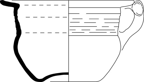 | 4b | hoge pispot met scherpe buikknik en rechte hals (met diverse ribbels), horizontaal geknikte rand (aan zijkant aangedrukte) rand, holle bodem |