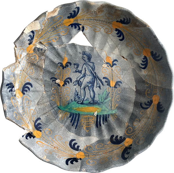 | 5c | blauw, oker, groen op wit; Dionysus met wijnglas in de hand, staande op ondergrondje tussen twee aigrette “bloemen” binnen aigrette rand polychrome decoratie bovenzijde |