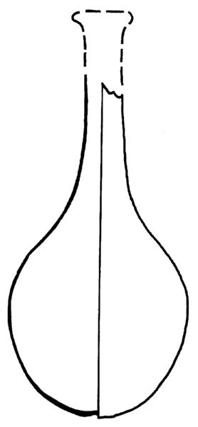 | 4b | kleine bolvormige tweezijdig afgeplatte parfumfles met lange hals en uitstaande of omgeslagen lip, met pontilmerk |