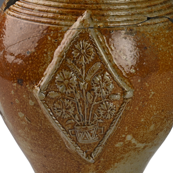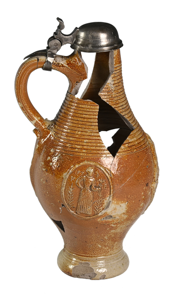 | 4b | bolle kan met schouder overgaand in hoge cilindrische hals, doorboord lintoor (voor bevestiging van tinnen deksel), op standvoet |