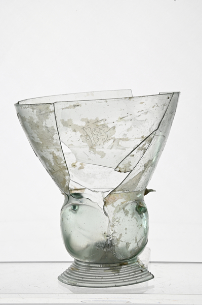 | 4b | roemer met conische cuppa , draad op de overgang naar de schacht en een horizontale rij grote platte noppen of grote platte puntnoppen, opgestoken bodem met pontilmerk, gewonden draadvoet |