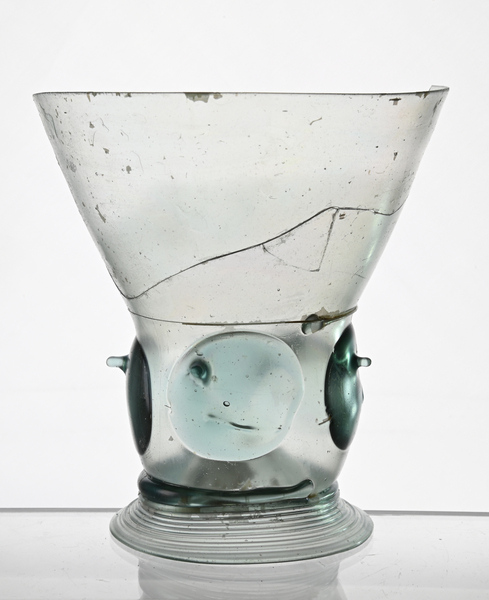 | 4b | roemer met conische cuppa , draad op de overgang naar de schacht en een horizontale rij grote platte noppen of grote platte puntnoppen, opgestoken bodem met pontilmerk, gewonden draadvoet |